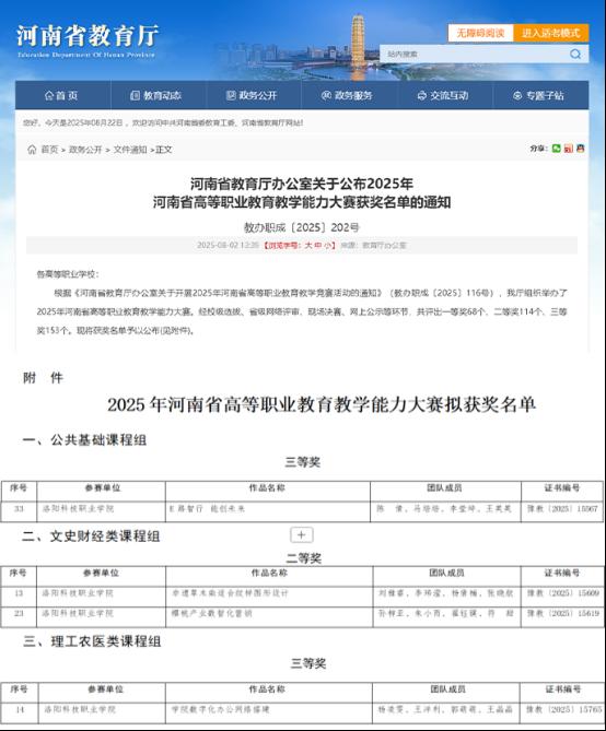 近日,河南省教育厅公布2025年河南省高等职业教育教学能力大赛获奖名单,洛阳科技职业学院凭借教师教学能力的显著跃升与教育创新实践的深度融合强势突围,在全省百余所高职院校、数百支顶尖参赛队伍的对决中,一举斩获2项二等奖、2项三等奖。这一成绩的取得不仅标志着学校教师教学能力实现从“量变”到“质变”的跨越式突破,更成为河南职业教育领域“内涵式发展”的标杆范例,为打造职业教育“洛科品牌”积蓄了磅礴动能,也向社会递交了一份“高质量育人”的亮眼答卷!