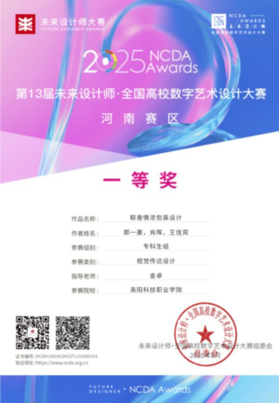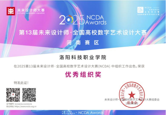 近日,2025年第13届未来设计师·全国高校数字艺术设计大赛(NCDA)全国总决赛及河南省赛区获奖名单正式揭晓。洛阳科技职业学院艺术与设计学院师生凭借扎实的专业能力、创新的设计理念与出色的技术表现,在比赛中屡创佳绩,共荣获国家级奖项5项(其中一等奖1项、二等奖3项、三等奖1项),省级奖项37项(一等奖9项、二等奖16项、三等奖12项),优秀指导教师奖13项,累计获奖达55项。同时,学校荣获河南省赛区“优秀组织奖”,充分彰显了学院卓越的教学实力与育人成果。