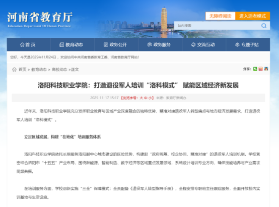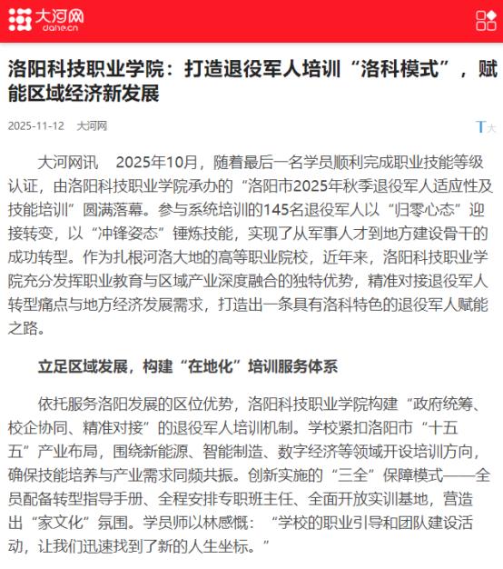 近年来,洛阳科技职业学院充分发挥职业教育与区域产业深度融合的独特优势,精准对接退役军人转型痛点与地方经济发展需求,打造退役军人培训 “洛科模式”。相关工作成果被河南省教育厅以及多家媒体报道。