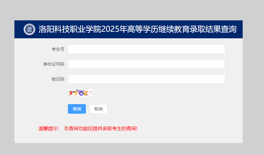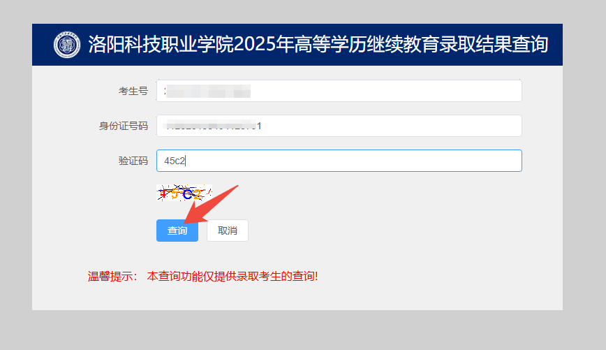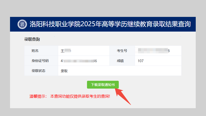 (五)进入“洛阳科技职业学院2025年高等学历继续教育录取结果查询”页面