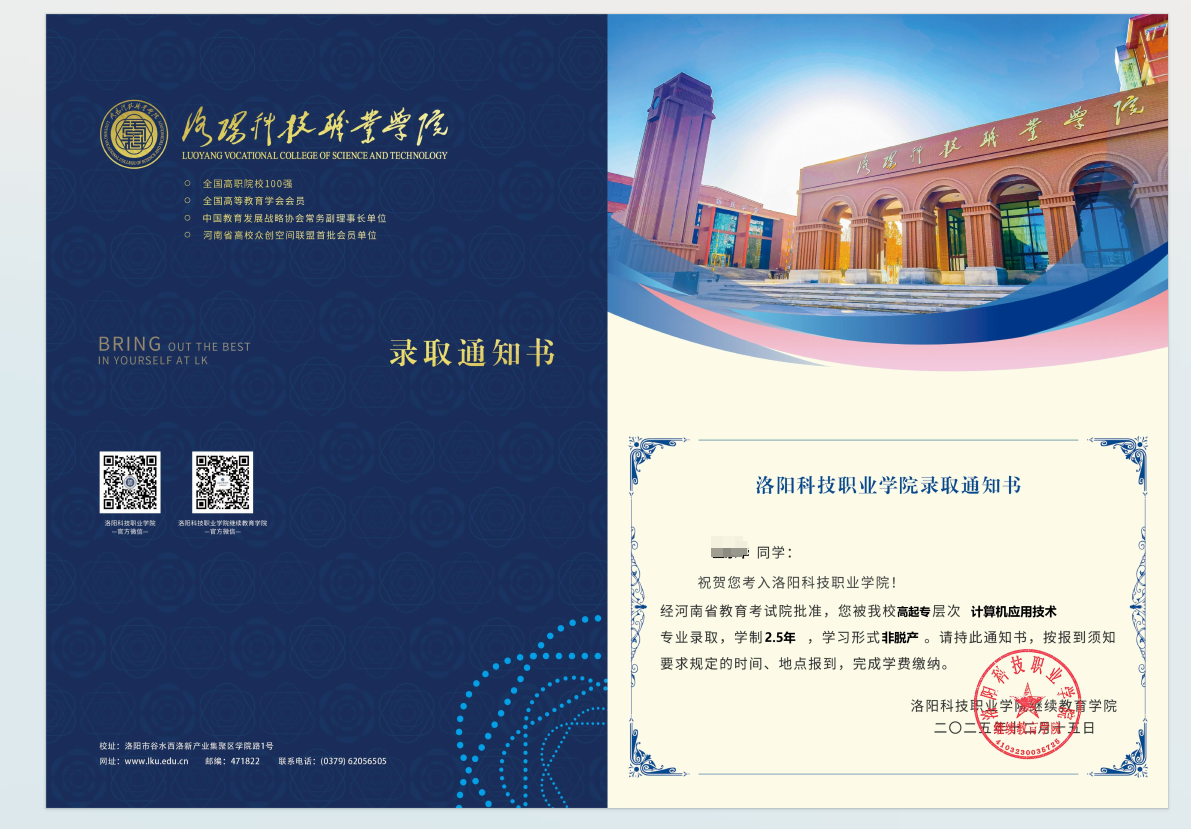 2026级新生同学你好!欢迎进入洛阳科技职业学院高等学历继续教育学习,请根据要求自行下载打印《录取通知书》并妥善保存。