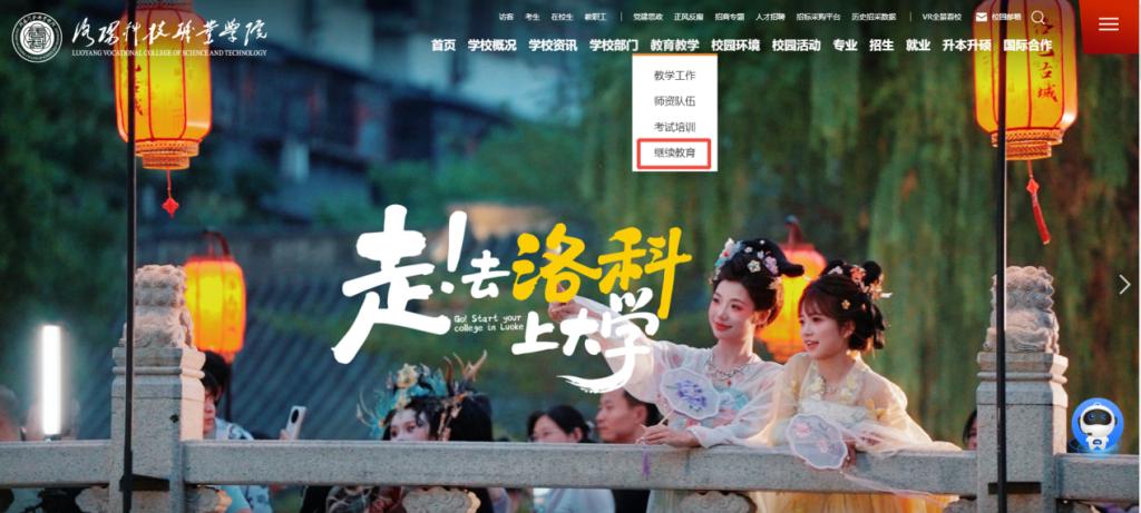 (二)选择教育教学,点击“继续教育”进入“洛阳科技职业学院继续教育学院”官网