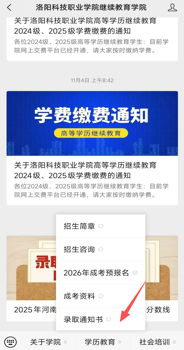关注“洛阳科技职业学院继续教育学院”微信公众号,点击“学历教育”“录取通知书”按照提示操作下载。